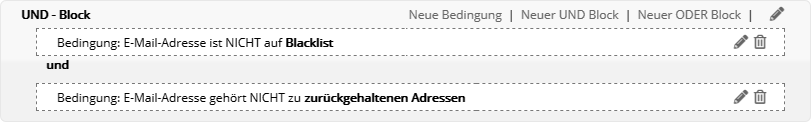 Insbesondere nach dem Kopieren einer vorhandenen Zielgruppe kann das sinnvoll sein, wenn die identischen Abonnenten in Original und Kopie nicht gewünscht sind. Bedingung anhand GutscheinFiltern Sie Abonnenten danach, ob und in welchem Zeitraum die Zuweisung oder Einlösung eines Gutscheins stattfand. Tipp: Um zugewiesene Gutscheine als eingelöst zu markieren, nutzen Sie entweder die Webservice-Funktion 'RedeemVoucherByCode' oder importieren in der Gutscheinübersicht eine CSV-Datei mit den eingelösten Gutscheincodes. Bedingung anhand SelektionMit diesem Bedingungstyp nutzen Sie eine per Webservice angelegte Selektion von Abonnenten als pn.mail-Zielgruppe. Der Bedingungstyp ist nur dann sichtbar, wenn per Webservice mindestens eine Selektion angelegt wurde. Das Besondere: In einer Selektion werden Abonnenten anhand einer Liste von IDs gruppiert. So lässt sich eine extern getroffene Abonnentenauswahl als Zielgruppe nutzen, ohne dass in den pn.mail-Abonnentendaten ein gemeinsames Merkmal vorliegen muss. Die Details entnehmen Sie bitte der Webservice-Dokumentation, die wir Ihnen gern zusenden. Bedingung anhand des Empfängers (geplant)Diese Bedingung entscheidet, ob ein Abonnent als Empfänger eines bestimmten Mailings vorgesehen war oder nicht. Das bedeutet, dass er in einer Abonnentenliste bzw. Zielgruppe für ein bestimmtes Mailing steht, welches versandt wurde. Im Unterschied zur letztgenannten Bedingung wird der tatsächliche Empfang jedoch nicht geprüft. Es sind auch alle Empfänger enthalten, die das Mailing z. B. aufgrund von Bounces, Blacklists oder serversseitigen Spamfiltern nicht empfangen haben. Bedingung anhand des Empfangens (zugestellt)Diese Bedingung entscheidet, ob jemand ein bestimmtes Mailing empfangen hat oder nicht. Das Mailing gilt als empfangen, wenn der E-Mail-Server des Abonnenten eine positive Rückmeldung erteilt hat. Im Schritt nach dem Empfang ist es dennoch möglich, dass das Mailing beim Empfänger in einem Spamordner landet. Bedingung anhand des BounceverhaltensDamit legen Sie Bedingungen anhand der Zustellungen oder Nichtzustellungen eines bestimmten Mailings an. Bedingung anhand Blacklist bzw. Zurückgehaltener AdressenAbonnenten, deren E-Mail-Adresse auf einer Blacklist oder der Liste der zurückgehaltenen Adressen steht, werden automatisch vom Versand ausgeschlossen. Dieselben* Abonnenten lassen sich per Zielgruppe filtern, etwa um sie beim Export Ihrer Abonnentendaten ebenfalls auszuschließen. Die kombinierte Zielgruppe sieht wie folgt aus: