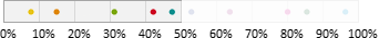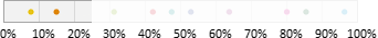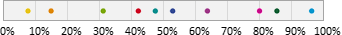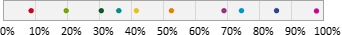 Auswahl-Wahrscheinlichkeit in ProzentGeben Sie einen Prozentwert zwischen 0 und 100% ein. Mit dieser Wahrscheinlichkeit gehört ein Abonnent zur Zielgruppe. Beispielsweise bewirkt ein Wert von 25%, dass ungefähr (siehe Hinweis) ein Viertel aller Abonnenten zur Zielgruppe gehören. Dazu verteilt pn.mail alle Abonnenten auf einem Zahlenstrahl zwischen 0 und 100%. Bei 10 "bunten" Abonnenten könnte eine Variante so aussehen: