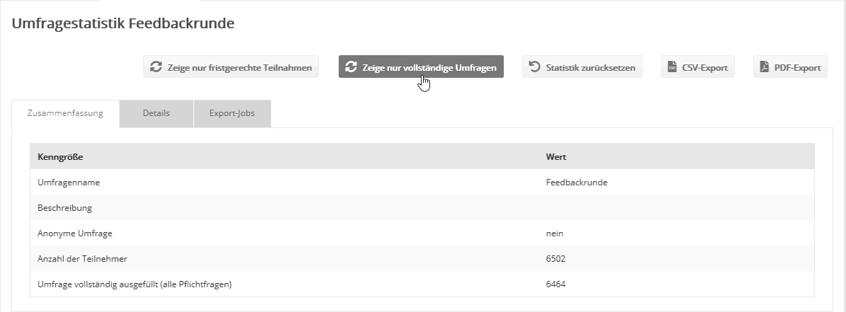 - PDF-Export: Exportiert die Umfragestatistik als PDF-Datei.