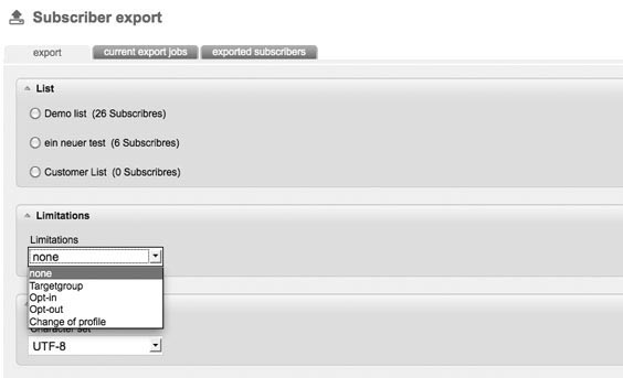 Subscribers lists can be exported from pn.mail as CSV – files. An advantage, for example, is that you can back up the address lists in this way. In the tab 'Export’, you can make choices of the lists that have to be exported. Per export only one subscriber list can be chosen. If you only want to export certain data records, you can decide on 'Limitations’. |