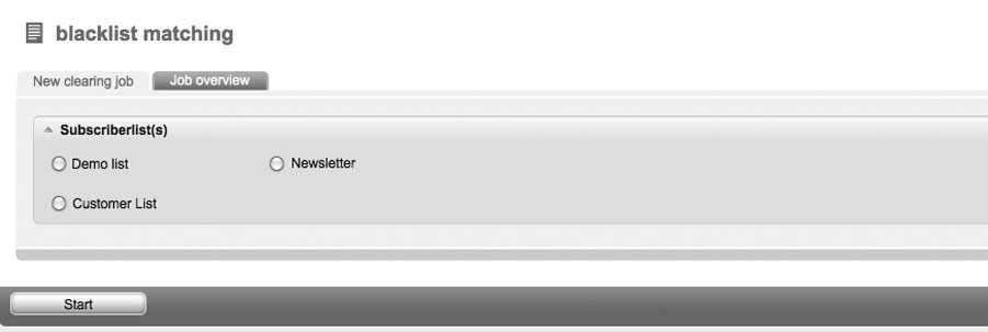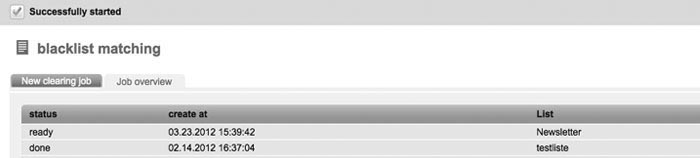 | You will find information on the blacklist and its function in 2.11 Blacklist. Via the function 'Blacklist matching', you can coordinate the data records of your subscriber lists with the entries in your blacklist. Detected subscribers will automatically be deleted by pn.mail. First, you have got to choose the subscriber list which has to be examined. By clicking the 'OK' button, you will confirm the appearing message to delete the search results. The result will show you how many subscribers were removed due to the fact that they are registered in the blacklist. |