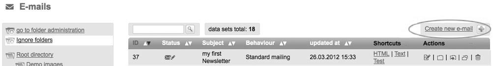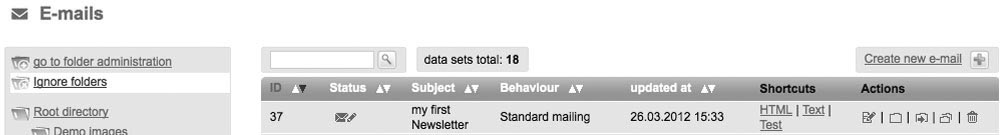 | All steps – starting from the draft up to the sending of your mailings – will be run through in this section. According to its purpose, each newsletter can be assigned one of the following three types: - Standard Mailing - Dialog Mailing - Campaign Mailing In the area 'Email', you can find out the mailing's purpose in the column 'Behaviour' at a glance. Standard Mailings are ordinary information newsletters which were created for a single dispatch. They are sent manually or time-controlled. Standard newsletters can either have the status 'drafted' or 'sent'. In the course of the opt in and opt out dialog, Dialog mails are automatically sent. Hence, this status means that a mail is integrated in the communication of the opt in or opt out process. When being introduced, the Dialog Emails are set to the state 'drafted'. In order to be automatically sent, the Dialog Emails must attain the status 'activated' after having been finished. If you want to edit the mailing once more, you must deactivate the email (status: paused). Dialog Mails may be integrated in the opt in or opt out processes by choosing 'Opt In Process' or 'Opt Out Process' in the tab 'Basic Settings'. The tab 'Basic Settings' can be found when clicking on the menu item 'System'. It is important to remember that by doing so you have set the Dialog Mail to the status 'activated'. Campaign Mailings may be used for dispatches in the course of a campaign. This topic is described in detail in 7.2 Campaigns. These mailings can be set to the status 'drafted', 'activated' or 'paused'.