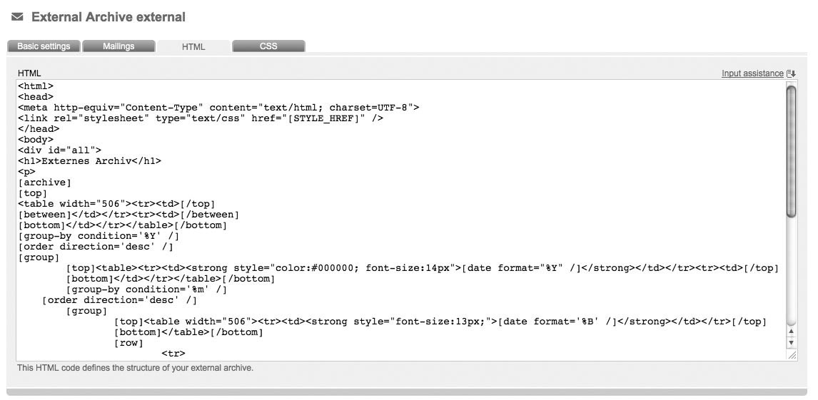 While creating your external archive, pn.mail generates an html source code in the background, which defines the structure of your external archive. If you want to edit the look of your shown archive, you have to edit the source code, which requires appropiate HTML knowledge.