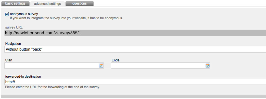 Furthermore you can create your survey with or without a back-button. Determine a starting- and ending-point through the calendar-icon. If a survey should be neverending, don't occupy those fields.
