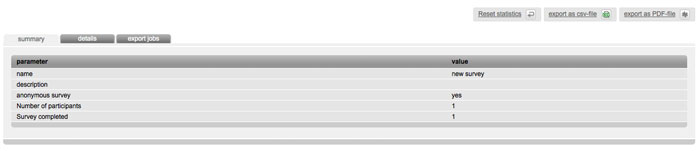 For interpretation of your survey-results click 'survey statistics'. In upper part you can see a summary of analysis information. Underneath you will find all questions in detail. Remove your statistic with a click on 'reset statistic'. All documented information will be reset to zero. Furthermore you've got the possebility to export all results into a .csv or .pdf file.