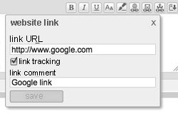 If you want to link to Google, for example, the text that is supposed to be linked must be selected, the icon clicked and the target URL in the address field entered. In order to make the links evaluable for the statistics, they should get tracked. For this, you only have to tick in the according link dialog. Furthermore, it is possible to track all links at once. In order to do so, you can tick this option in the tab 'advanced settings'.