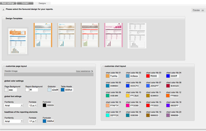Now you also can adjust the design of your report. Choose the tab 'designs'. By default pn.mail suggests you six different layouts. HTML experts can also open the 'advanced settings' below the layouts to edit the html-code. For example you can insert your logo in th header.