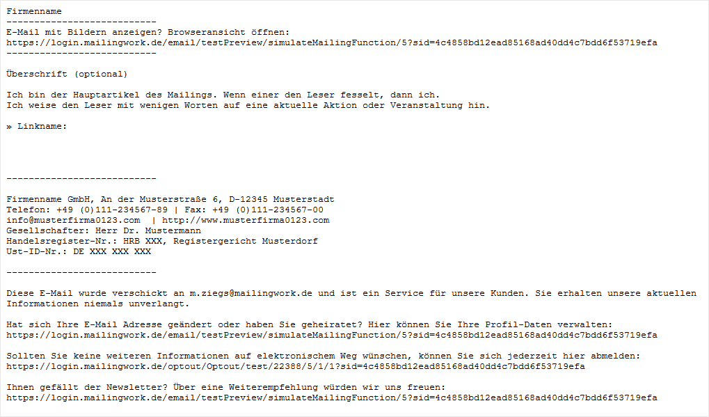 FormatIn der Regel sollten Sie die Voreinstellung 'Multipart' beibehalten, da Sie damit den größten Empfänger-Kreis bedienen. Multipart bedeutet, dass das Mailing intern aus einer HTML-Version und einer Textversion besteht. So bekommen Ihre Empfänger automatisch die zu Ihrem E-Mail-Programm passende Variante angezeigt. Siehe folgender Screeenshot: Die HTML-Variante einer Multipart-E-Mail enthält alle Formatierungen und Bilder, während die Text-Variante lediglich unformatierten Text enthält und damit auch von sehr alten oder auch speziellen E-Mail Clients problemlos angezeigt werden kann. |