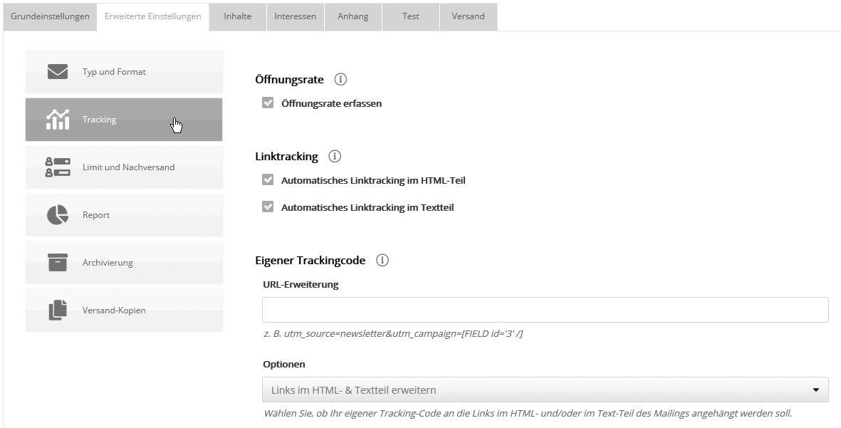 ÖffnungsrateUm nach dem Versand auszuwerten, wieviel Prozent der Empfänger das Mailing geöffnet haben (siehe 'Übersicht, Öffnungs-/Klickrate'), muss die Option 'Öffnungsrate erfassen' aktiviert sein. Dazu integriert pn.mail im HTML-Teil des Mailings ein unsichtbares Zählpixel, welches für jeden Empfänger individuell verlinkt ist und dessen Aufruf als Öffnung gezählt wird. Die Messung funktioniert unabhängig von der Mailing-Einstellung 'Inboundimages', solange der Empfänger die Anzeige von Bildern in seinem Posteingang nicht unterdrückt. Hinweis: Ist die Erfassung der Öffnungsrate deaktiviert, aber die nachfolgende Option "Linktracking" aktiviert, dann werden Klicks automatisch auch als Öffnung gewertet. Die Öffnungsrate erfasst in dem Fall nur den Teil der Öffner, der irgendeinen Link angeklickt hat. LinktrackingAktivieren Sie Automatisches Linktracking im HTML-Teil, so wird jeder im Mailing enthaltene Link durch einen Tracking-Link ersetzt, der für jeden Abonnenten individualisiert ist. Diese Tracking-Links werden über den pn.mail-Server auf die ursprüngliche Link-URL umgeleitet und dabei gezählt. Damit können Sie nach Versand des Mailings sehen, wie oft jeder Link angeklickt wurde (siehe 'Übersicht, Öffnungs-/Klickrate'). Weiterhin lassen sich darauf basierend Zielgruppen bilden, z. B. "Alle, die Link B angeklickt haben" können erneut mit weiteren Informationen angeschrieben werden. Bitte beachten Sie, dass Sie jede URL vorher als Link definieren müssen. Sie können die Richtigkeit der Tracking-Links überprüfen, indem Sie sich ein Testmailing zusenden. Eigener Tracking-CodeHier ist es möglich, alle Links des Mailings automatisch um eigene Parameter zu erweitern. Damit lässt sich das weitere Verhalten der Newsletterempfänger per Website-Analyse-Tools wie z.B. Google Analytics, Piwik oder econda tracken. Kopieren Sie dazu den Tracking Code Ihres Tools in das Feld, damit pn.mail ihn automatisch an alle externen Links Ihres Mailings anhängt. Folgende Parameter werden unterstützt: