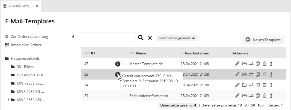 Haben Sie das Modul 'Redaktionssystem Advanced' für Ihr Multi-Account-System gebucht, lassen sich Elemente wie E-Mails, Templates, Zielgruppen oder Kampagnen zentral im Adminaccount erstellen und anschließend in die Subaccounts der Kunden verteilen. Auch das Verteilen aus einem Subaccount nach oben in den Adminaccount oder in andere Subaccounts ist möglich. In den Übersichten von E-Mails, Templates, Kamapgnen und überall dort, wo sich Elemente verteilen lassen, finden Sie in der Spalte 'Aktionen' ein Pfeil-Symbol zum Verteilen.
