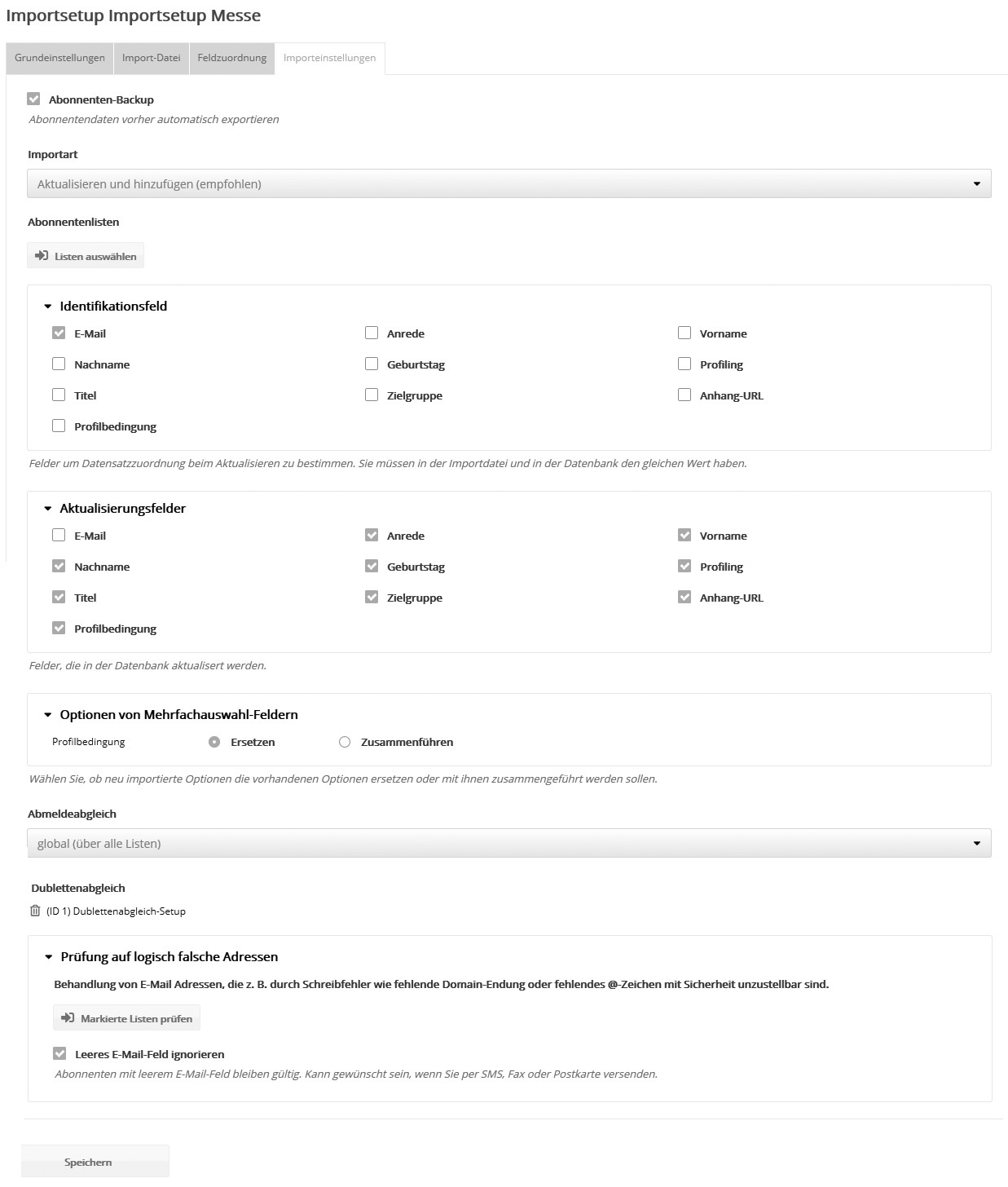 Setups: ImportsetupsIn einem Importsetup lassen sich die Einstellungen eines Abonnentenimports abspeichern und für zukünftige Importe mit einem Klick wieder anwenden. Die Nutzung von Importsetups ist dann sinnvoll, wenn Sie Ihre Abonnenten regelmäßig in dieselbe Abonnentenliste importieren und die Struktur Ihrer Importdatei unverändert bleibt (Anzahl und Reihenfolge der Spalten). Sie können beliebig viele Importsetups anlegen, so dass zukünftig für jede wiederkehrende Importaufgabe ein Setup zur Verfügung steht. So sparen Sie Zeit und erleichtern auch unerfahrenen Kollegen den reibungslosen Ablauf des Importvorgangs.