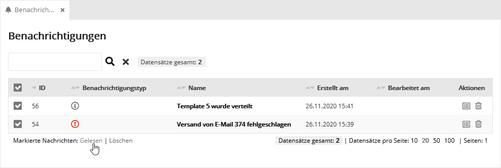 Erfolg oder Fehler: Element im Mandantensystem verteilenWird im Mandantensystem ein Element (Template, Mailing usw.) in andere Accounts verteilt, erhält jeder beteiligte Account eine Benachrichtigung. Das gilt ebenso für die accountübergreifende Änderung des Aktivierungsstatus eines Elementes. Die häufigste Fehlerursache ist ein nicht eingetragener Stellvertreter am Element eines Zielaccounts, etwa der Stellvertreter eines Templates beim Verteilen einer E-Mail. Die Stellvertreter sind notwendig, damit das verteilte Element alle benötigten Bestandteile unabhängig von (eventuell abweichenden) IDs in jedem Ziel-Account zuordnen kann. Die Nachricht im Quellaccount teilt mit, zu welchem Zeitpunkt in wieviele Zielaccounts die Verteilung erfolgreich oder fehlerhaft war. Fehler: WebHook fehlgeschlagenSchlägt der Aufruf eines WebHooks wiederholt fehl, weil die hinterlegte URL nicht erreichbar ist, wird dieser WebHook vom System automatisch deaktiviert. Parallel wird eine Systembenachrichtigung erzeugt. Möchten Sie einen WebHook wieder aktivieren, öffnen Sie die Nachricht und klicken Sie den gewünschten Aktivierungs-Link an. Dabei können Sie entscheiden, ob die in den ersten 5 Tagen nach Deaktivierung aufgelaufenen Ereignisse nachgeholt werden sollen..