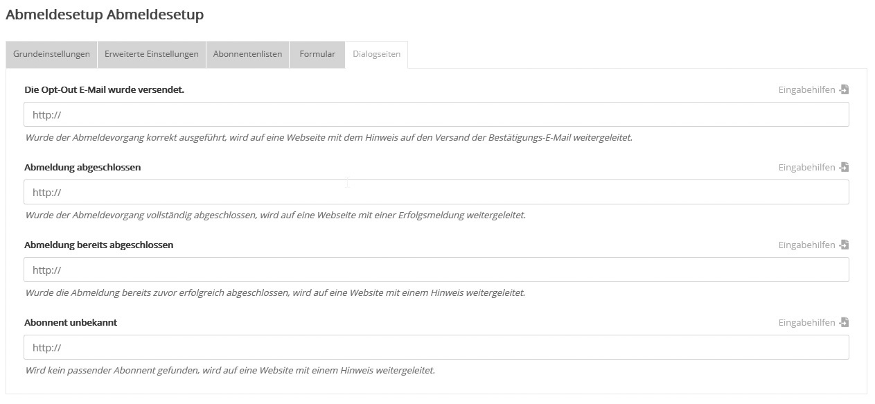 AbonnentenlistenJe nachdem, ob die Abmeldung per Newsletter-Link oder per Website-Formular stattfindet, wird der Abonnent aus folgenden Listen abgemeldet: Variante 1: Abmeldelink im NewsletterFür Standardmails gilt: Zusätzlich zu den auf dem Reiter 'Abonnentenlisten' gewählten Listen findet die Abmeldung auch in den angeschriebenen Listen statt. Für Kampagnen- und Dialogmails gilt dieser Zusatz nicht, da diese nicht an eine bestimmte Liste verschickt werden. Variante 2: Abmeldeformular auf WebsiteDie Abmeldung findet in den unter 'Abonnentenlisten' markierten Listen statt, und wenn vorhanden, dann auch in den direkt im Formular zur Auswahl durch den Nutzer angebotenen Listen (siehe nächster Abschnitt 'Formular'). Beides gleichzeitig ist nicht möglich. Das heißt: Sobald Sie eine Liste im Reiter 'Abonnentenlisten' markiert haben (und damit fest vorgeben), kann sie nicht gleichzeitig im Abmelde-Formular (ab)wählbar sein. Im dem Fall wird sie automatisch aus dem Formular entfernt und umgekehrt. Sonderfall beim Abmeldeformular: Ist keine Liste zur Abmeldung markiert und auch im Formular keine enthalten, dann findet die Abmeldung in allen Listen statt. Damit wird der Abonnent auch aus der 'Abonnentenverwaltung' entfernt. FormularHier erstellt pn.mail automatisch den Quellcode für ein Abmeldeformular, das Sie auf Ihrer Website einbinden können. Den Inhalt des Formulars stellen Sie per Drag&Drop zusammen. Die Bedienung ist identisch zum Anmeldeformular-Editor. Nach Klick auf den Button 'Test des Formulars' wird Ihr neues Abmeldeformular angezeigt und die Funktion lässt sich anhand realer Abmeldungen testen. Geben Sie gültige und ungültige Abonnentendaten ein, um die entsprechenden Textmeldungen bzw. Dialogseiten zu prüfen. Ein während des Tests abgemeldeter Abonnent lässt sich unter 'Abonnenten' -> 'Abmeldungen' wiederherstellen. --> Hinweis zu Abmeldungen beim Testversand: Solange es sich um den Testversand eines Mailings handelt, findet bei Klick auf den Abmeldelink keine Abmeldung statt. Stattdessen wird lediglich eine Bestätigung angezeigt, ob das Abmeldesetup korrekt eingerichtet wurde. Erst beim späteren realen Versand findet eine tatsächliche Abmeldung statt und es erscheint die von Ihnen eingestellte Dialogseite, die Sie unter 'Formular testen' jederzeit testen können. Dialogseiten |